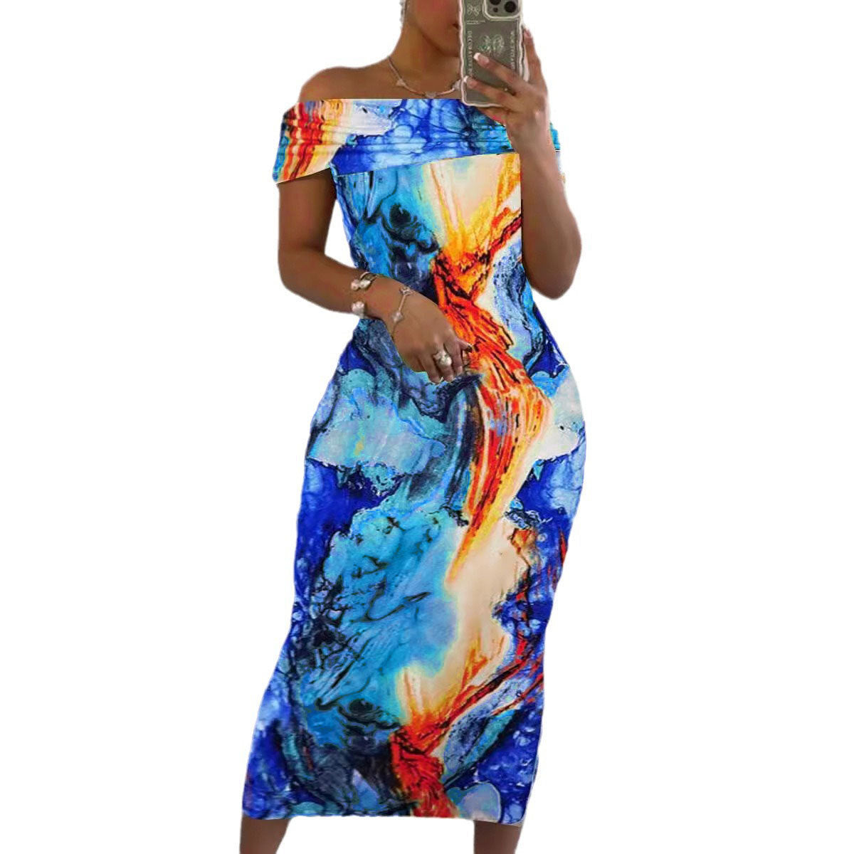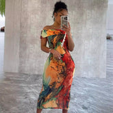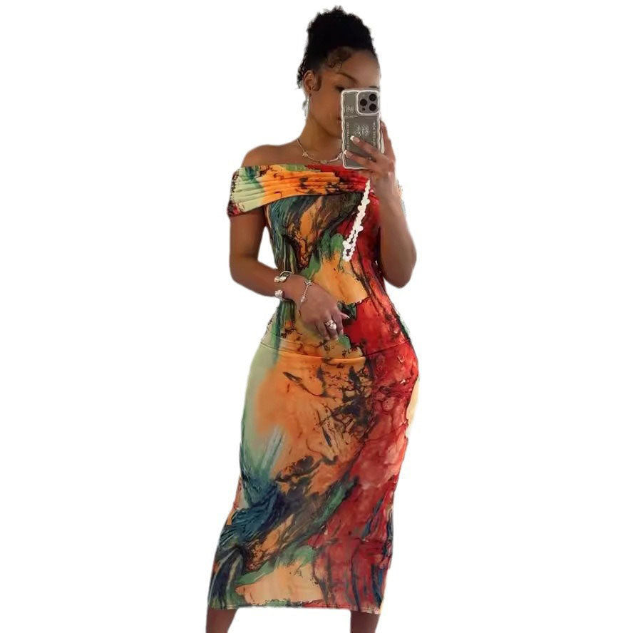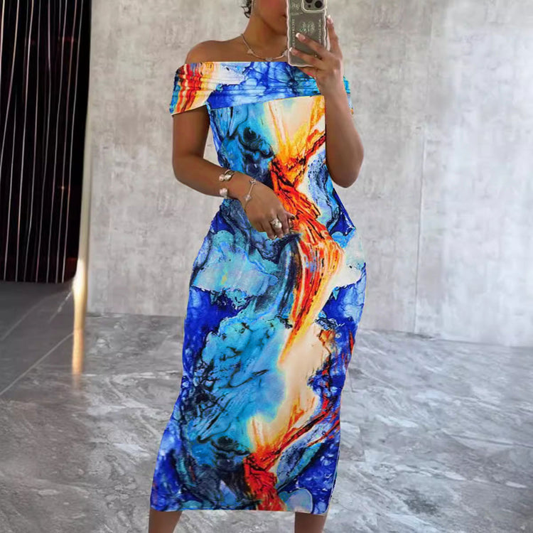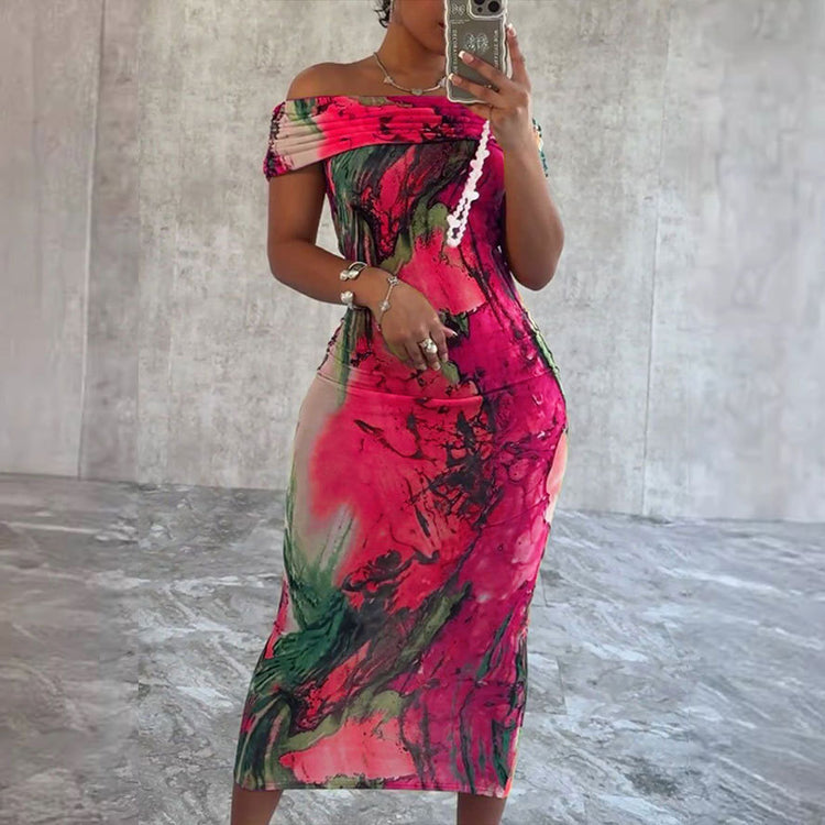 Abstract Print Off-Shoulder Sheath Dress, Slim-Fit Straight Neck for Spring & Summer